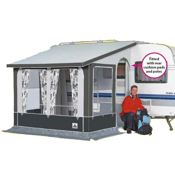 DOREMA OSLO PORCH AWNING This 4 season universal porch awning is designed for the most ardent of winter and touring campers in mind. It’s functional design and materials lends itself ideally to all season or winter use. Made of a very strong PVC coated polyester material that is very simple to clean. Both sides walls have a door fitted and the front panel can rolled down or removed.