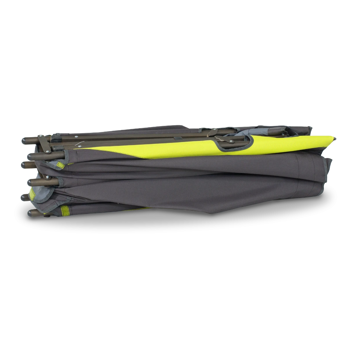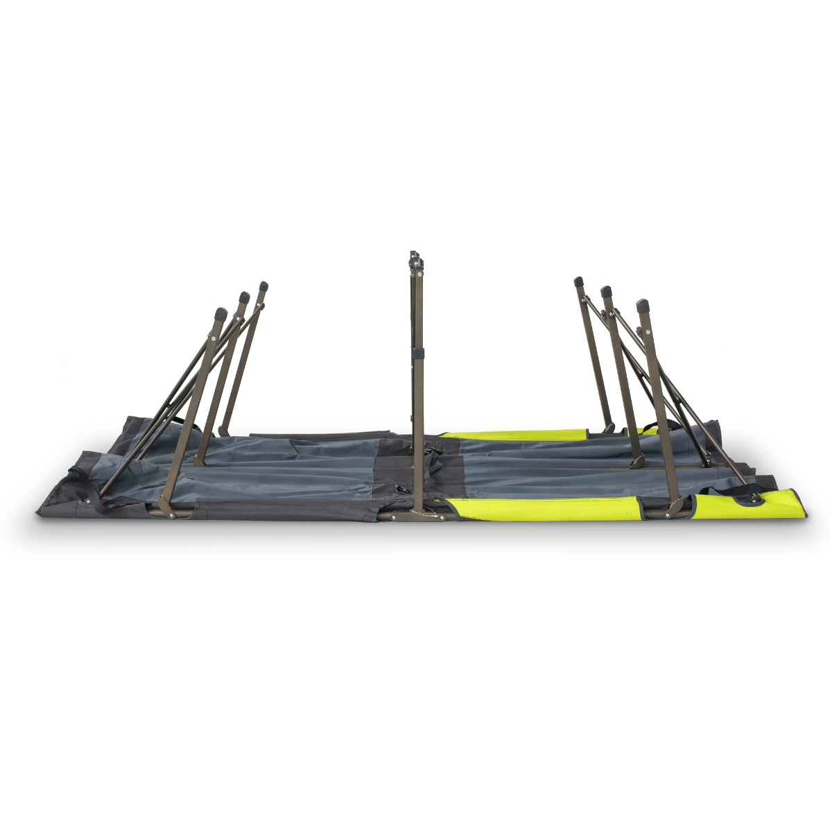 An incredibly comfortable and supportive sleeping option for two. The Speedy Bed Twin folds open in seconds with a single action assembly and packs down small for transport and storage. The open frame and tall profile provide vital storage space underneath. Corner elastic straps allow a Monstamat Twin or Twin Bomber 3D to be secured on top, for the ultimate camping sleep set-up.